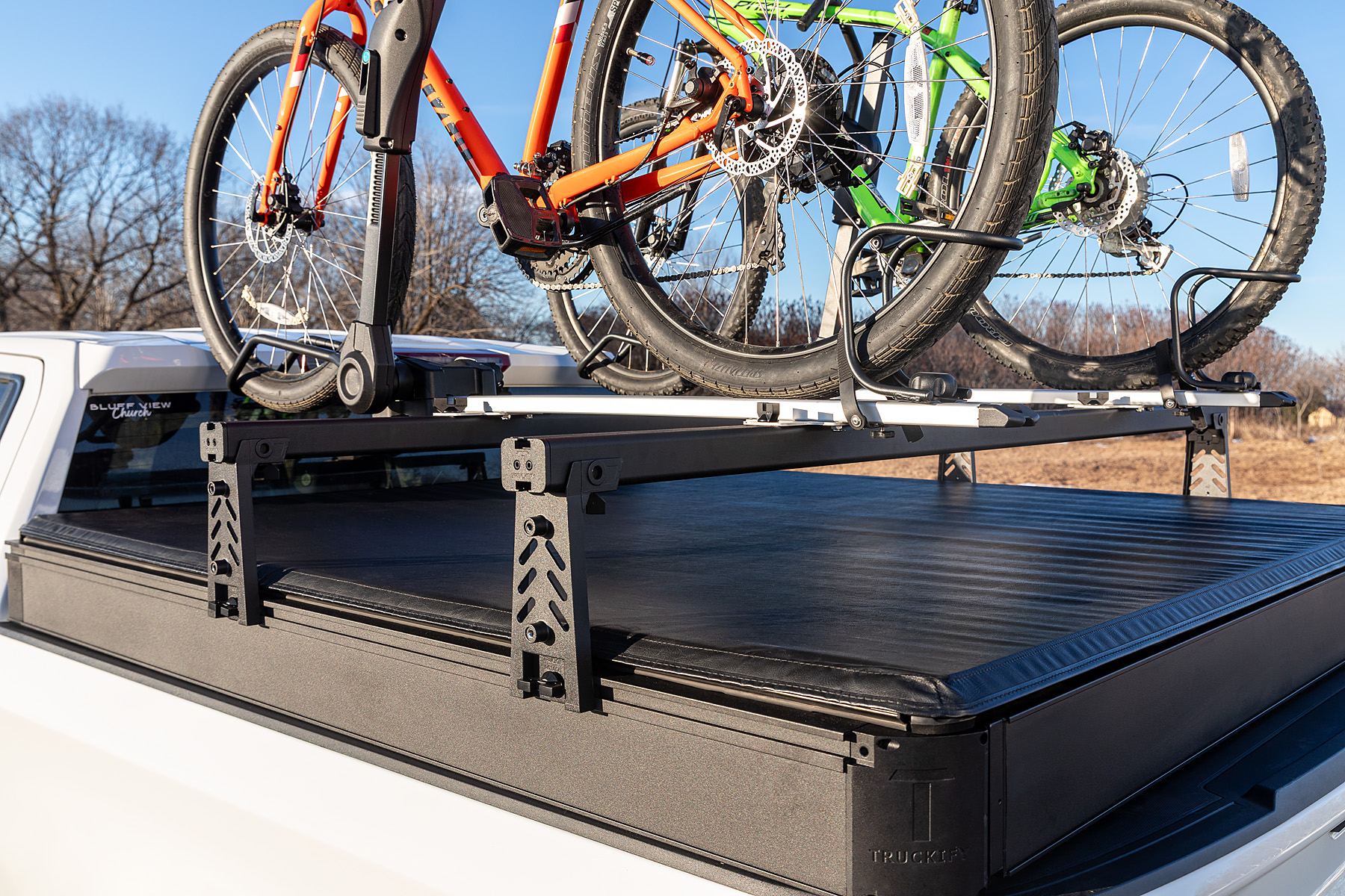 Hauling bikes on a weekend trip couldn’t be easier. When your truck bed is full of gear, there’s no place for bikes. With the bike mount kit, you can haul almost every kind of bike securely above your bed cover. Fat tire bikes can also be mounted, but they must not have a tire width that is more than 2 3/4". Designed to be incredibly user friendly, mounting bikes is fast and simple. Everything is easily and quickly adjusted, with no extra tools needed. Quickly removed and folded flat for storage.